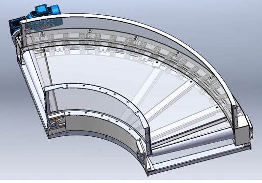 工作原理:沿着输送轨迹两端各分布两根锥形滚筒,输送带也为扇形,驱动滚筒滚花处理,带动输送带运动;输送带外侧安装有导条,导条被导轮固定在预设好的轨迹线上,导轮固定在机架上,如下图所示: