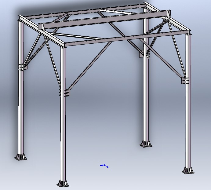 如图所示,机架由4根立柱作为主要支承,选用Φ219*t6.0圆钢,主轨道选用25A工字钢,主结构拉撑选用20A工字钢,其他三角形结构拉撑选用6.3#槽钢,结构件板材均为10mm厚碳钢板切割焊接而成,脚板为25mm厚碳钢板;