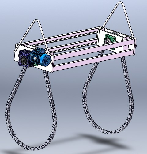 本设备选用两个电动葫芦作为起重葫芦,单个葫芦最大可吊重3t。两个电动葫芦横向相对固定,将其中一个电动葫芦的运动小车拖拽电机卸下,另外一个电动葫芦的保留,实现两个电动葫芦横向同步运行;电动葫芦起重滚筒拖拽电机电路上主电路为单独设置,控制电路中按下升和降的按钮两个电动葫芦同时运行,两个电动葫芦上下产生的累计误差导致的两个葫芦吊高不同采用两个电动葫芦相同高度的上限位消除。