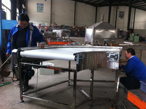 四川输送机之90°转弯皮带线已完工,宽度900,高度950,机身采用3mm钢板折弯,支架采用40*40的方管,托板采用1.5mm钢板,皮带采用2.0白色pu皮带,电机200W带变频器,输送速度1-12米/分钟。刚才全部采用304不锈钢制作。