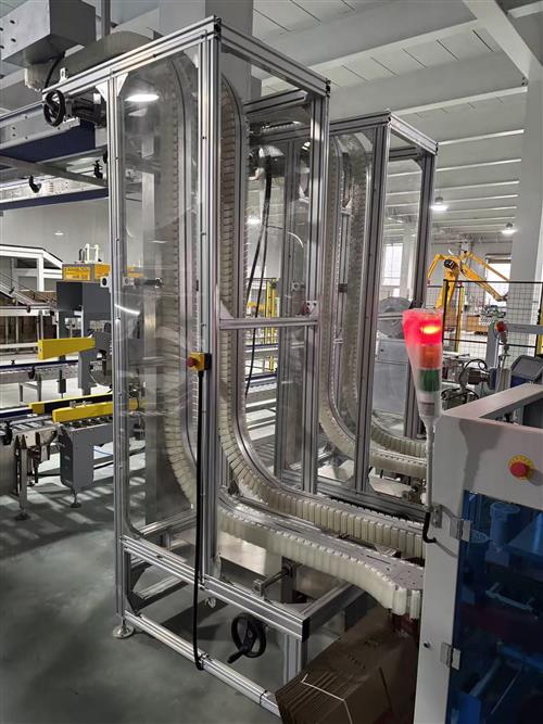 四川输送机制作的夹箱机完工,机架采用40*60的专用铝型材,横梁采用40*80专用铝型材,调节宽度可以根据输送产品尺寸调节,输送链条采用专用夹瓶链条,用于将产品直接在楼层间进行提升或下降,设备占地面积小,提高厂房利用率,结构简单,运行可靠,易于维护,采用手动调节宽度装置,适用多种物料输送,适用产品对象为瓶装、听装、塑料盒、纸箱包装等产品,广泛的应用于饮料,食品,药品,塑胶,电子组件,印纸,汽车零部件的制造等行业,但是输送货物不宜太大和太重。成都输送设备厂家四川开尔芯主要生产皮带输送机,滚筒输送机,链板输送机,模块化链板输送机,悬挂喷涂生产线,抛丸机,提升机系列等,需要了解更多输送设备相关知识,可参见其它文章或来电咨询。